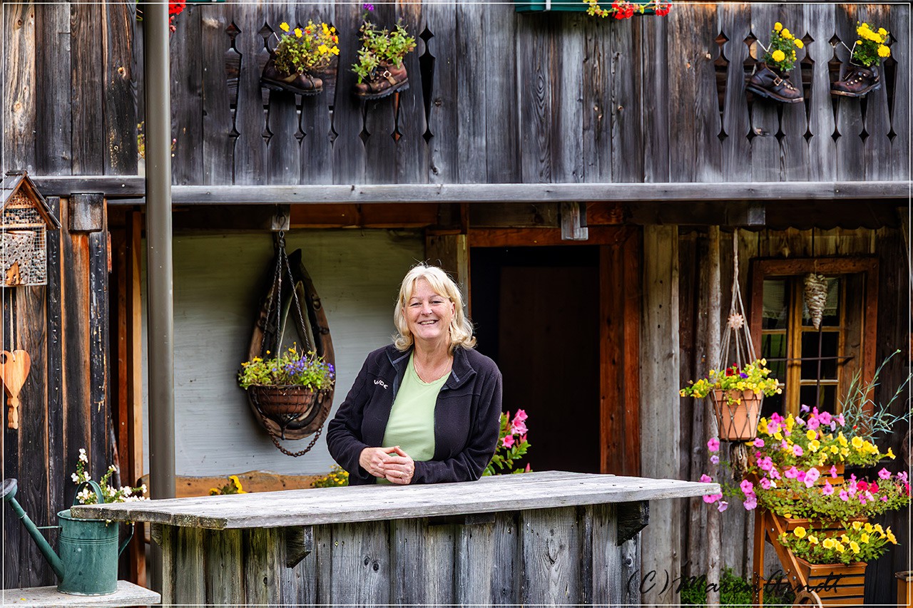 Wirtin Karin im Langalmtal vor der Petodnig Hütte