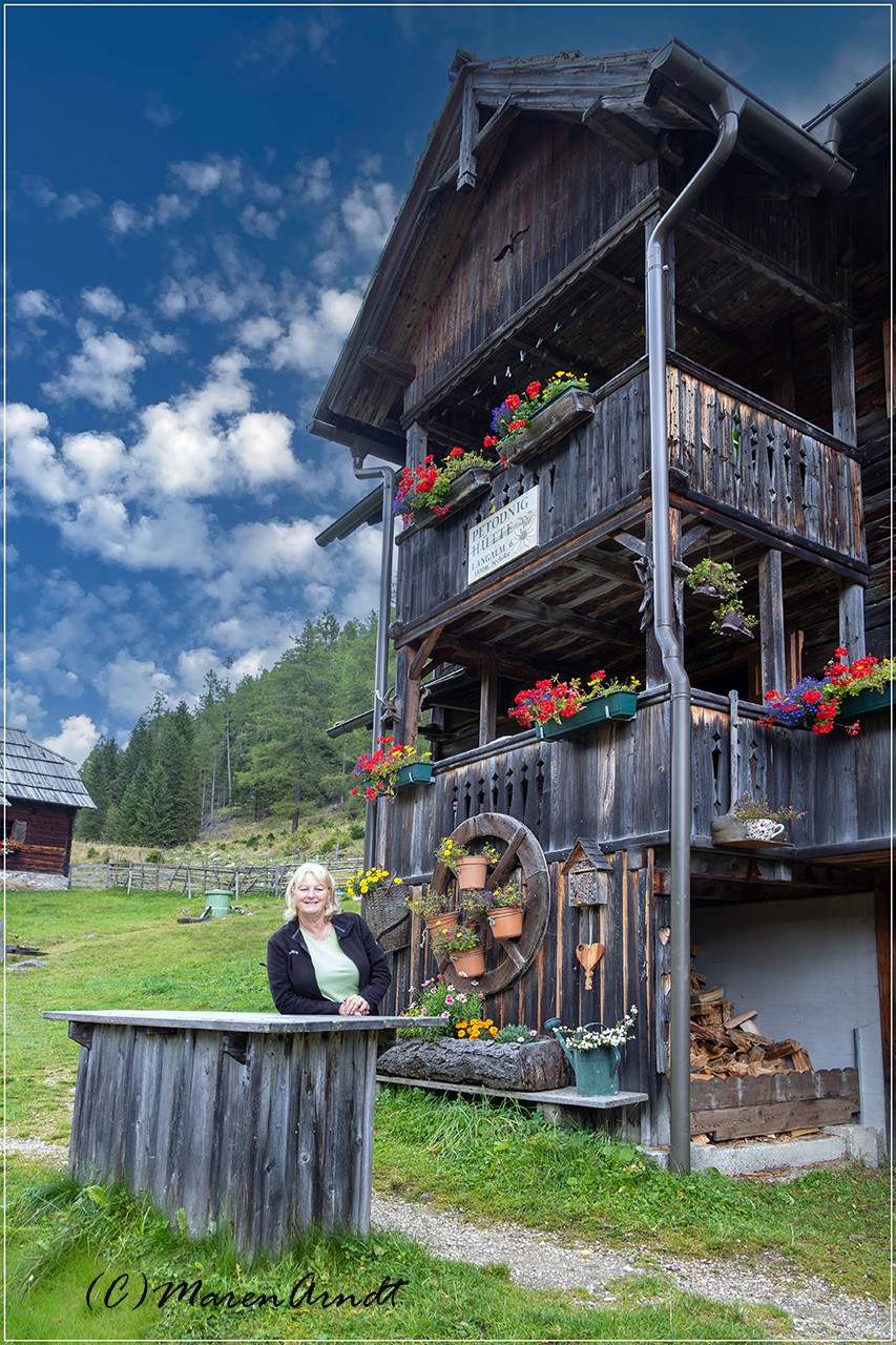 Wirtin Karin im Langalmtal vor der Petodnig Hütte
